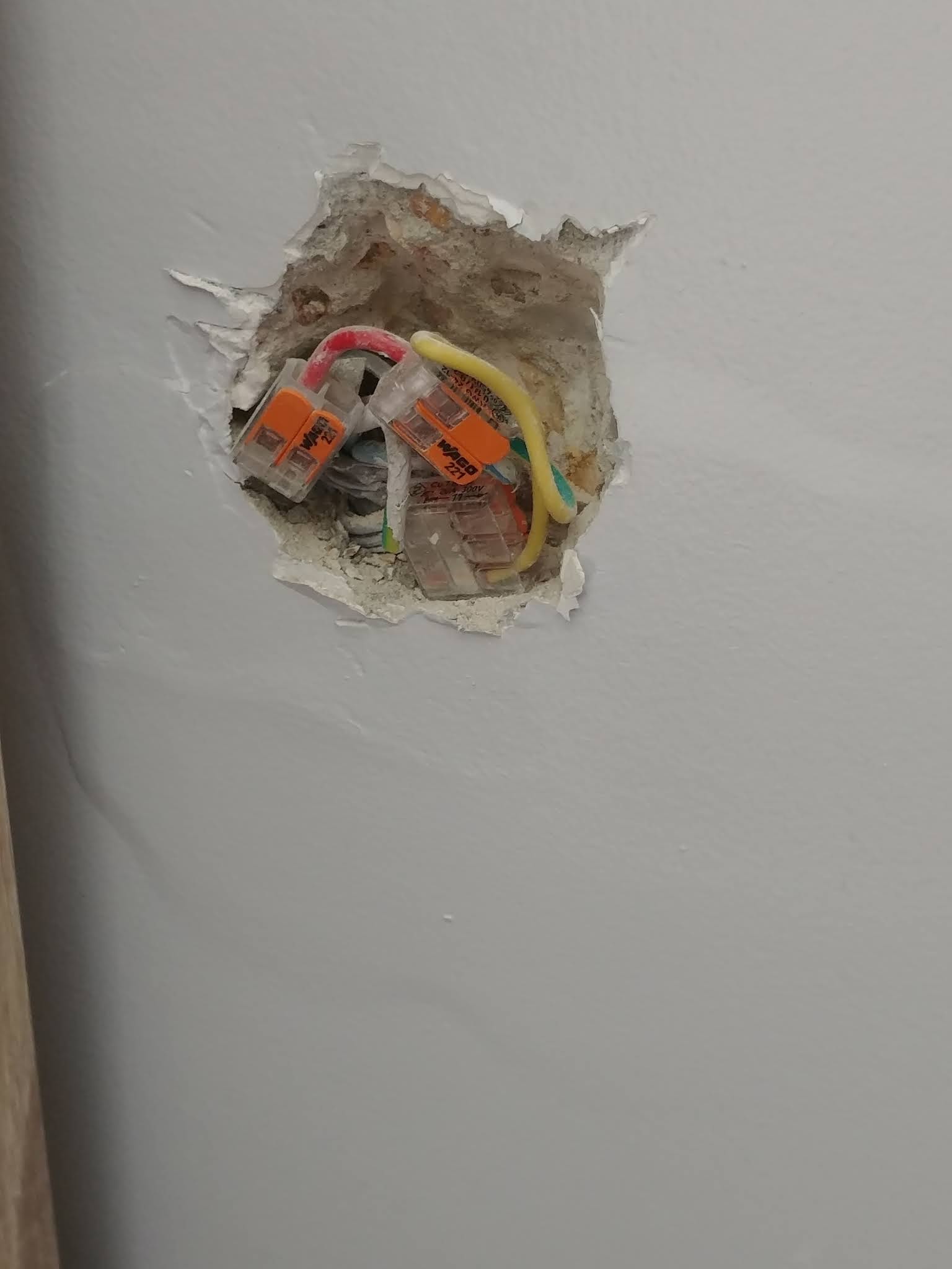 Le débit du paiement est instantanné, mais la fin des travaux a dû être faite par d'autres artisans, professionnels pour le coup. Des travaux non terminés pourtant payés, une infiltration dans les toilettes dûe à la douche qui a été mal posée, avec un joint silicone médiocre qui a été refait par eux, fuyait toujours. Ensuite refait par un autre artisan et ça a corrigé le problème. Des trous visibles dans les joints de carrelage du bac de douche ont causé au fort taux d'humidité dans le placo des WC, résultat ci-dessous. Du cablage visible seulement sécurisé par Wago à 50cm d'un lavabo. Une sortie de cables pour radiateur non fermée. Quand il faut encaisser, c'est le jour même, mais quand il faut venir travailler, c'est le silence radio.