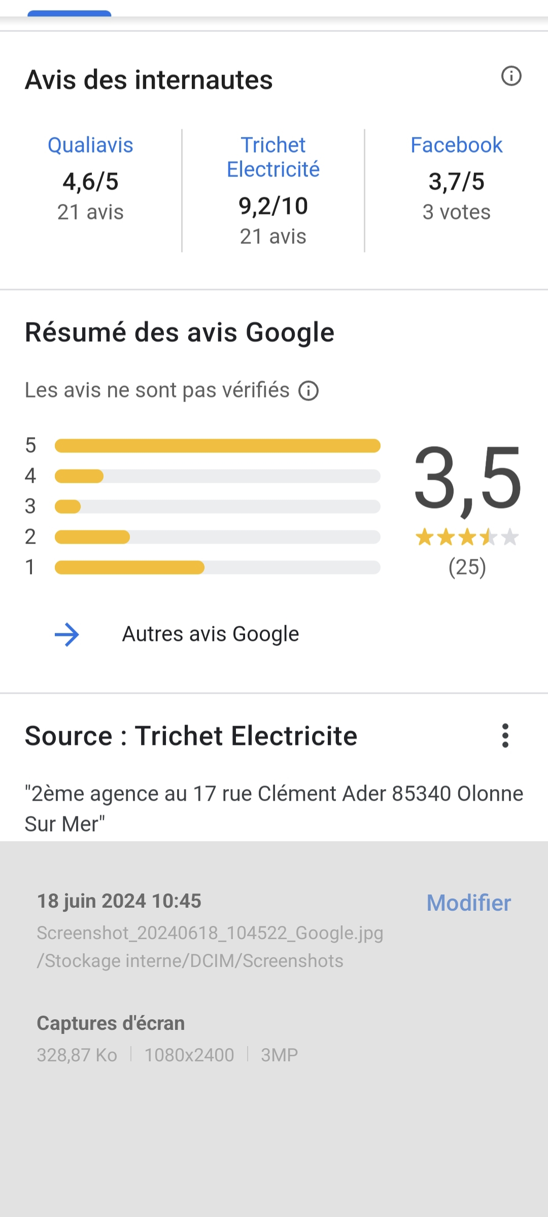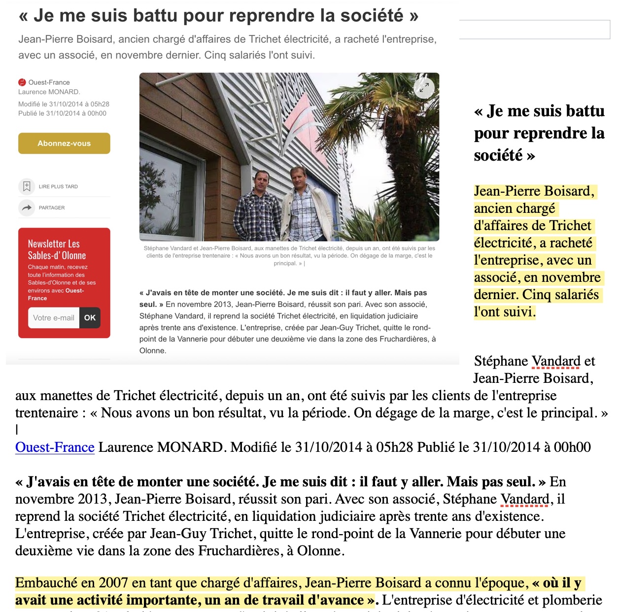 Indique 2ème agence à Olonne. C'est faux selon le registre des sociétés. Indique ne rien avoir de commun avec l'enseigne Trichet qui a pourtant été rachetée par M. Boisard qui était chargé d'affaires chez Trichet depuis 2007. La méfiance semble être la qualité à avoir avant toute chose. Bien d'autres choses à affirmer avec toutes les preuves que l'entreprise efface, modifie ou conteste selon les besoins.